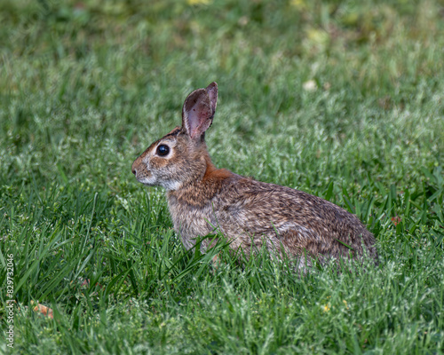 Cute rabbit sitting in grass gazes