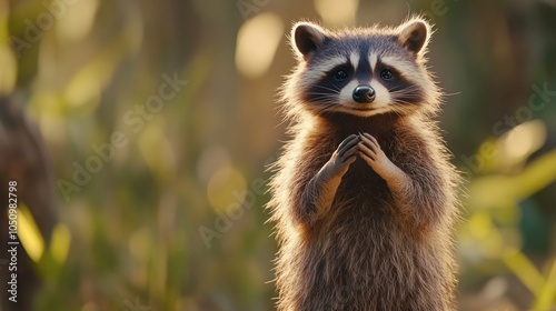 Cute raccoon standing in a dreamy forest setting