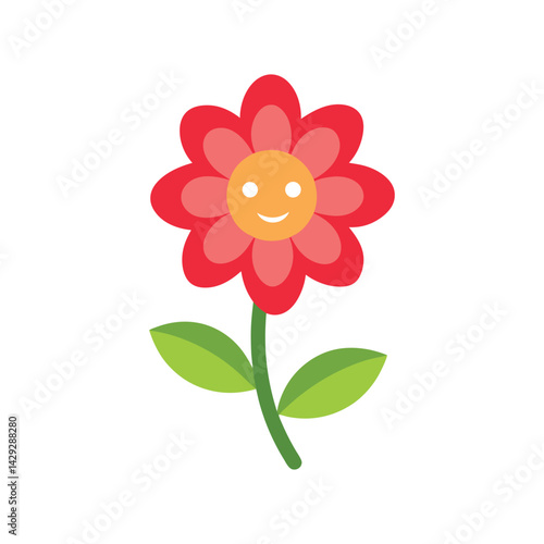 flower, cute, red, illustration, vector, happy, smile, smiling face, flower petals, stem, leaf, green, cartoon, simple, icon, graphic, clip art, nature, plant, spring, summer, cheerful, childish, children, decorative, isolated