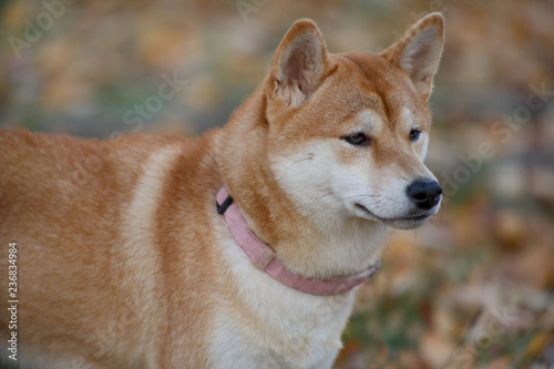 Cute red shiba inu is standing in the autumn park. Pet animals.