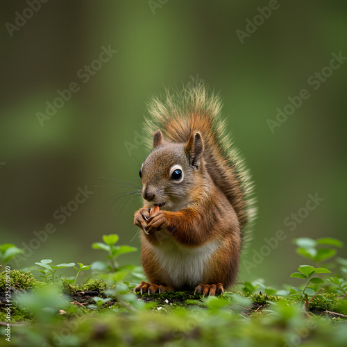 Cute red squirrel, Sciurus vulgaris, eating a nut in a green spring forest with copy space. Lovely wild animal with long ears and fluffy tail feeding in ...