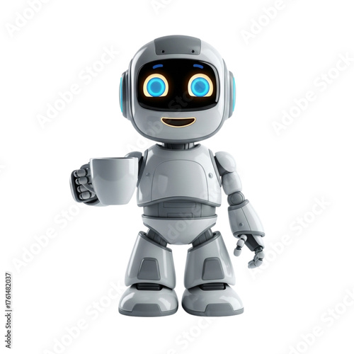 Cute robot holding a coffee cup, isolated on transparent background