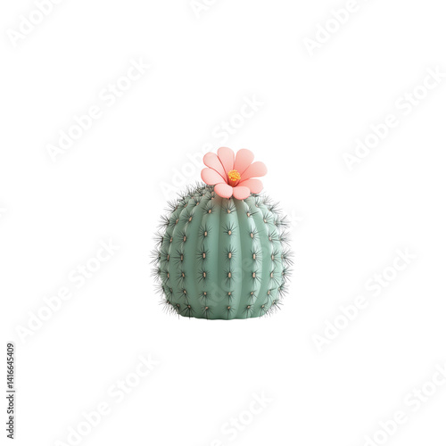 Cute Round Cactus with Pink Flower on a Bright White Background