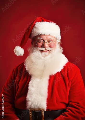 Cute Santa Claus in red clothes with a long white beard on a red background. Generative AI.