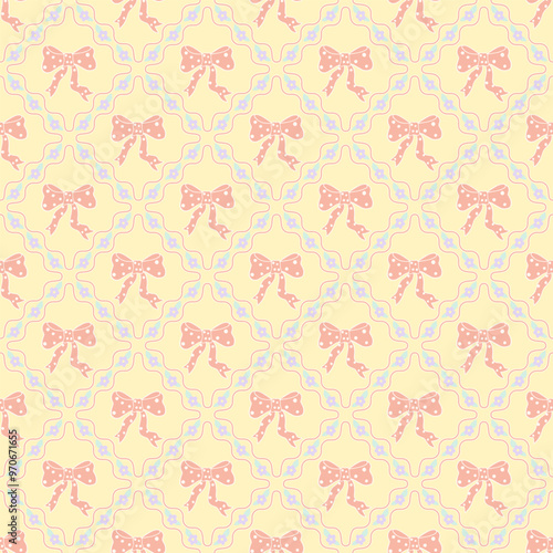 Cute seamless pattern with pink ribbon bows and small flowers.