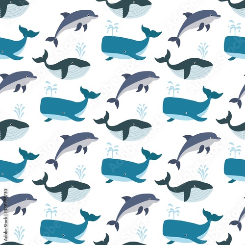 Cute seamless pattern with whale, dolphin, sperm whale on a white background. Sea animals in a flat style. Cartoon wildlife for web pages. Stock vector illustration for decor and design, textiles