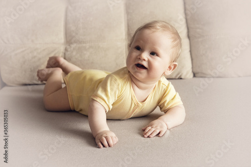 Cute six month old baby lying on his stomach on a bed on a beige background. Soft focus, copy space.