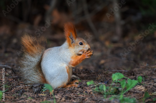 Cute squirrel eating nuts in the Park. Squirrel with fluffy tail close-up holding a nut, blurred background.