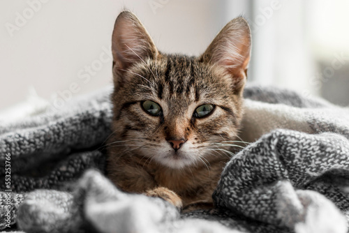 cute, striped, kitten, wrapped, foulard, closeup, muzzle, knitted, blanket, cosy, warm, concept, cat, children, sofa, pet, small, funny, animal, beautiful, play, felino, mammal, young, pretty, tabby, home, white, hide, sweet, interested, curious, 1, looking, adorable, furry, rest, copy, space