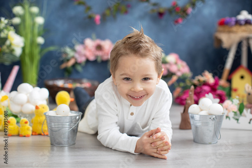 Cute stylish toddler child, boy with white shirt, playing with eggs and chocolate bunny on Easter decoration