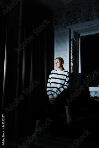 Cute stylish young woman in black leggings and striped jumper sitting on sofa. Women's fashion, women's casual style.