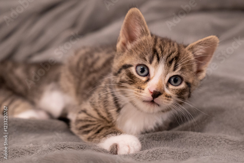 Cute tabby kitten lying on a grey blanket.