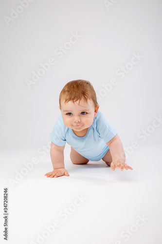 Cute toddler boy 8 months old in blue bodysuit sits on white background, space for text