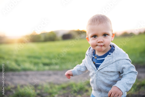 Cute toddler spending time outdoors. Baby on family walk k in spring nature. Happy family moment for new parents