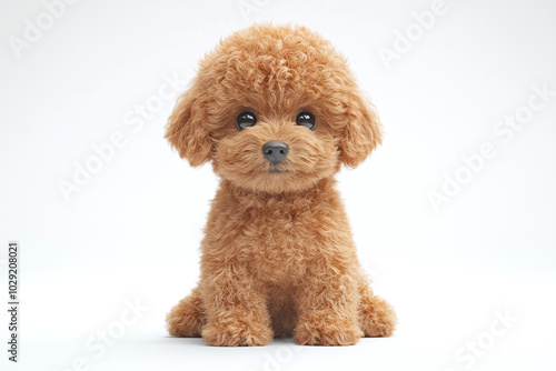 Cute Toy Poodle: A Toy Poodle sitting with its curly coat and an alert expression against a white background.
