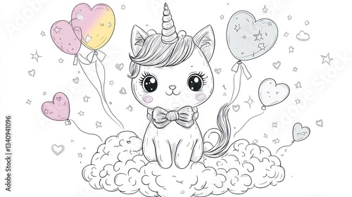 Cute unicorn cat on a cloud with balloons, whimsical children's illustration, ideal for coloring book, cards, or prints
