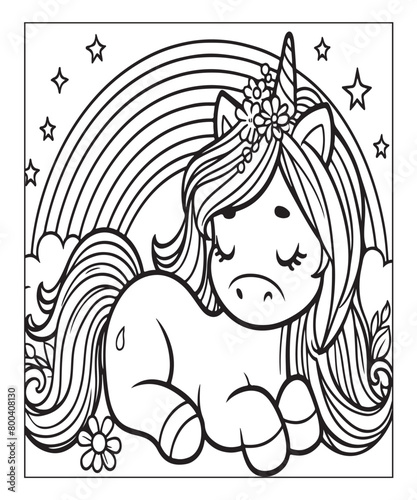 Cute unicorn with rainbow coloring page for kids. black and white vector illustration for coloring book, Generative AI