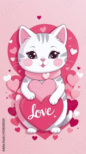 Cute Valentine card in kawaii style. Lovely cat with pink hearts. Inscription Love you. Can be used for t-shirt print, stickers, greeting card design. Vector illustration EPS8