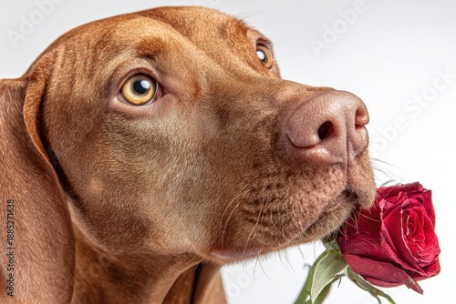 vizsla, dog, rose, pet, animal, portrait, cute, brown, flower, mouth, eye, fur, white, background, closeup, detail, expression, nature, love, gift, beauty, canino, domestic, mammal, nose, ear, head, close, soft, texture, profile, colours, floral, arrangement, single, isolated, studio, photo, companion, friendly, playful, adorable, charming, elegant, visual, image, design