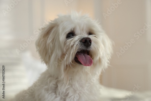 Cute white Maltese dog at home. Adorable pet
