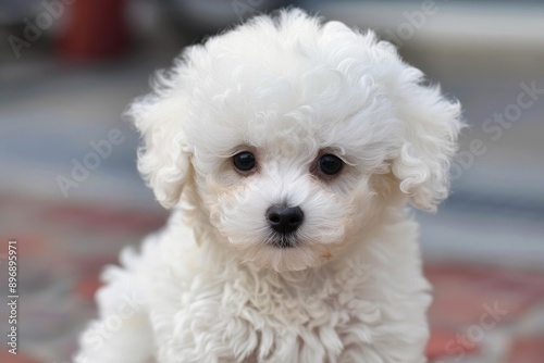Cute white puppy with curly fur looking at the camera with a soft focus background