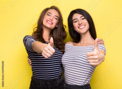 cute, young, background, friends, yellow, showing, beautiful, caucasian, female, girl, happy, people, pretty, woman, adult, attractive, friendly, friendship, portrait, positive, standing, 2, ethnic, party, style, gesture, cheerful, fun, looking, satisfied, ok, agree, emotion, expression, gorgeous, hand, lady, modern, signs, success, joy, approve, hug, hugs, recommend, thumb up, good