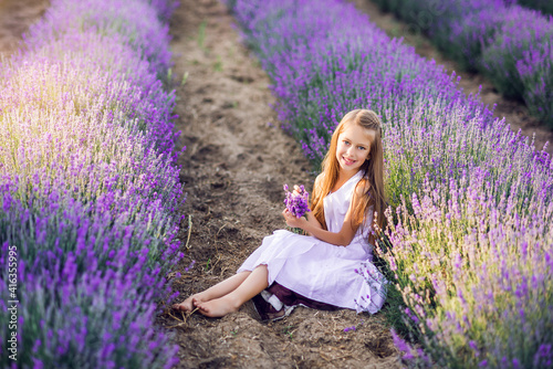 cute young girl collects lavender. A girl sits in lavender in the sun.