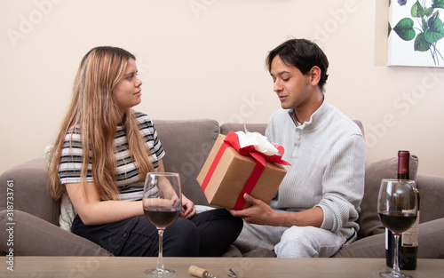 Cute young latin couple exchanging gift for valentines day