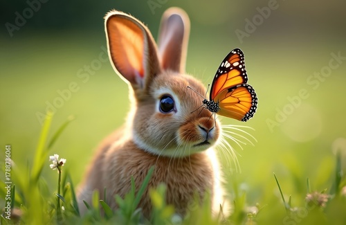 Cute young rabbit sits in green grass with orange butterfly on nose. Gentle small mammal looks curious in soft sunlight. Nature scene, springtime innocence, wildlife encounter.