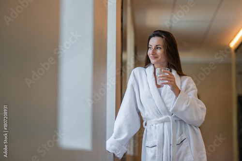 Cute young woman in white bath robe feeling comfortable and relaxed