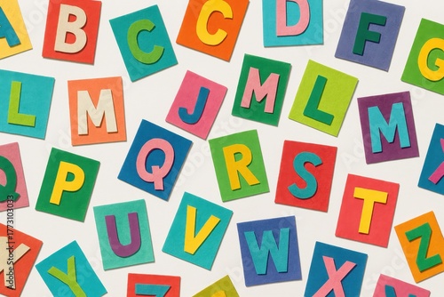 Cutout paper collage alphabet colorful letters scattered on white playful craft typography