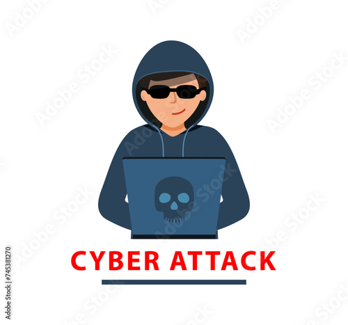 Cyber attack. man in a black hoodie is sitting at a laptop. cyber thief. Hacker is sitting at computer, cracking website or personal data. vector illustration isolated on white
