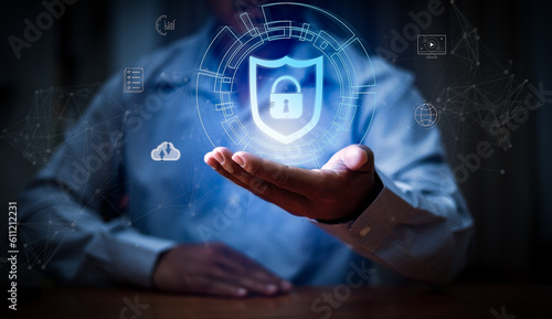 Cyber security and data protection. Businessman holding padlock protecting business and financial data with virtual network connection. Innovation technology develop smart solution from digital attack