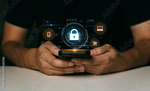 Cyber security concept, man hand protection network with lock icon and virtual screens on smartphone.
