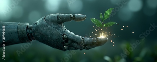 cybernetic, hand, plant, ai, robotic, green, energy, technology, digital, art, nurturing, growth, future, innovation, science, machine, artificial, intelligence, botanical, organic, metal, mechanical, electric, power, sustainable, development, progress, evolution, modern, advanced, complex, synthetic, composition, nature, life, automation, engineering, computing, network, system, circuit, program, algorithm, datum, interface, screen