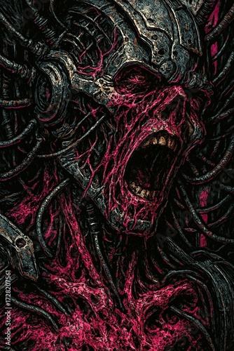 horror, scream, wire, cable, metal, bolt, screw, machine, flesh, face, blood, cyber, tortured, cybernetic, fusion, head, skull, red, pain, terror, twisted, anatomy, grotesque, cry, crucified, nightmare, nerve, black, tube, hostile, dark, mechanic, body, socket, monster, artificial, fear, tech, mouth, trauma, stitched, cracked, raw, skin