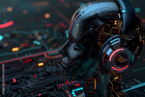 ai, human head, earphones, digital artwork, futuristic, artificial intelligence, robot, circuit board, colourful, dark background, technology, modern, science fiction, cybernetic, electronic, tech, closeup, digital illustration, cyber, robotic, synthetic, innovative