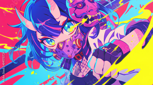 cyberpunk anime girl oni mask mascot neon rainbow background