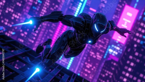 character, flying, futuristic, city, night, figure, sleek, neon, action, adventure, science fiction, digital artwork, technology, urban, building, structure, artificial, intelligence, suit, helmet, glowing, light, violet, magenta, blue, laser, motion, movement, energy, graphic, design, rendering, concept, skyline