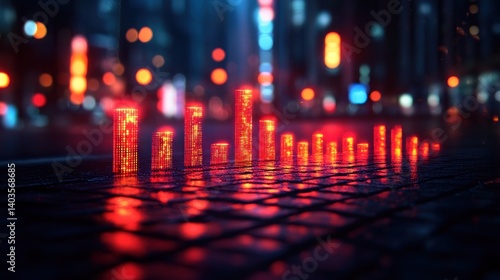 city landscape, night, neon, light, digital, datum, column, wet, pavement, technology, urban, future, modern, red, orange, dark, glowing, illuminated, street, graphic, abstract, design, artistic, high-coloured, intense, vibrant, shiny, bright, atmospheric, futuristic, science fiction, fantasy, energy, power, progress, innovation, growth, signal