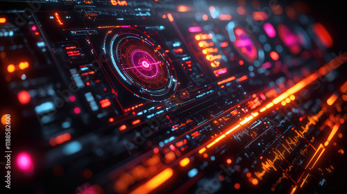 Cyberpunk Control Panel: A futuristic control panel glows with vibrant neon orange and blue hues, intricate circuitry and a central targeting system pulsating with energy.