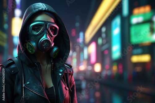 girl, leather, hoodie, jacket, gas-mask, protective, goggles, filter, futuristic, urban, science fiction, technology, punk, fashion, rebel, alternative, cosplay, character, female, cool, stylish, neon, grunge, edgy, dark, apocalyptic, hacker, cyber, underground, city landscape, digital, retro, rebellion, artificial intelligence, surveillance, modern, fantasy