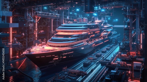 ship, yacht, vessel, boat, futuristic, neon, light, glowing, dark, night, technology, industrial, machinery, metal, steel, structure, building, modern, design, science fiction, digital artwork, rendering, three-dimensional, model, illustration, artwork, graphic, blue, red, pink, purple, orange, black, dark blue, water, dock, platform, crane, vehicle, transport, cargo, container, reflective, high-coloured