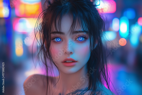 portrait, woman, neon, futuristic, eye, robot, glowing, city landscape, cybernetic, dark, vibrant, holographic, sleek, urban, led, chrome, reflections, intensity, high technology, mystique, shadow, electric, digital, rebellion, wired, punk, aglow, edgy, synthetic, beauty, model, glamour, style, club, night, looking, closeup, eye, lip
