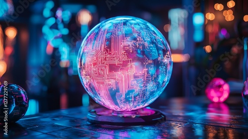 Cyberpunk-themed disco ball with glowing circuitry patterns, reflecting electric blue and pink hues, set in a high-tech lounge filled with holographic decorations