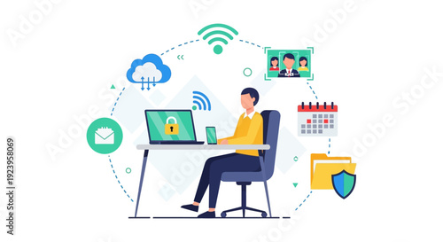Cybersecurity & Data Protection Concept: Man Working Remotely with Secure Cloud Services, Online Privacy, and Network Security