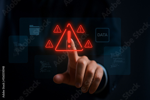 Cybersecurity alert interface with hand touching warning icon on virtual screen, data breach concept in futuristic digital environment