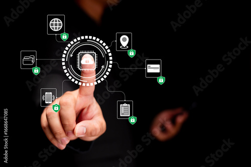Cybersecurity and secure data access. A businessman uses a digital touchscreen in a modern office to interact with encrypted information icons, ensuring privacy