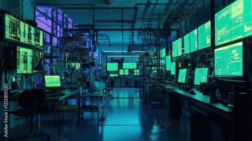 technology, computer, screen, network, datum, security, digital, system, server, monitor, office, electronic, hardware, software, cyberspace, code, web, programming, control, monitoring, analysis, workplace, interior, desk, lighting, green, blue, futuristic, modern, room, night, dark, artificial, intelligence, automation, dashboard, graphic, design, interface, information, processing, tech, operation, center