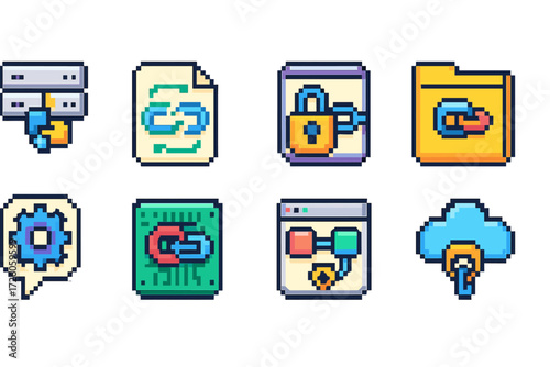 Cybersecurity pixel icon set. network, encryption, security pixel art icons collection